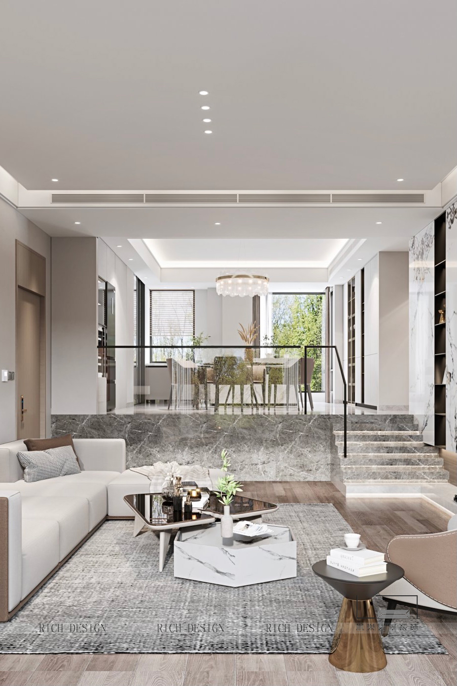 開(kāi)放式布局是形式和精神的交匯融合,通過(guò)大理石和暖棕的色彩構(gòu)成來(lái)渲染氛圍,描摹了高級(jí)階層向往的休閑生活場(chǎng)景。
