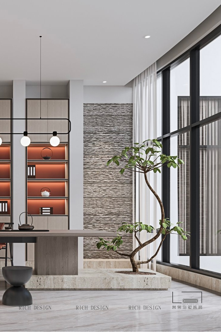 書(shū)房目之所及,窗外視野一覽無(wú)余,繁華如畫(huà)。室內(nèi)通過(guò)自然紋理木飾面、綠植等材質(zhì)元素的運(yùn)用,以簡(jiǎn)練的設(shè)計(jì)語(yǔ)言,渲染出質(zhì)樸寧?kù)o的生活品質(zhì)。