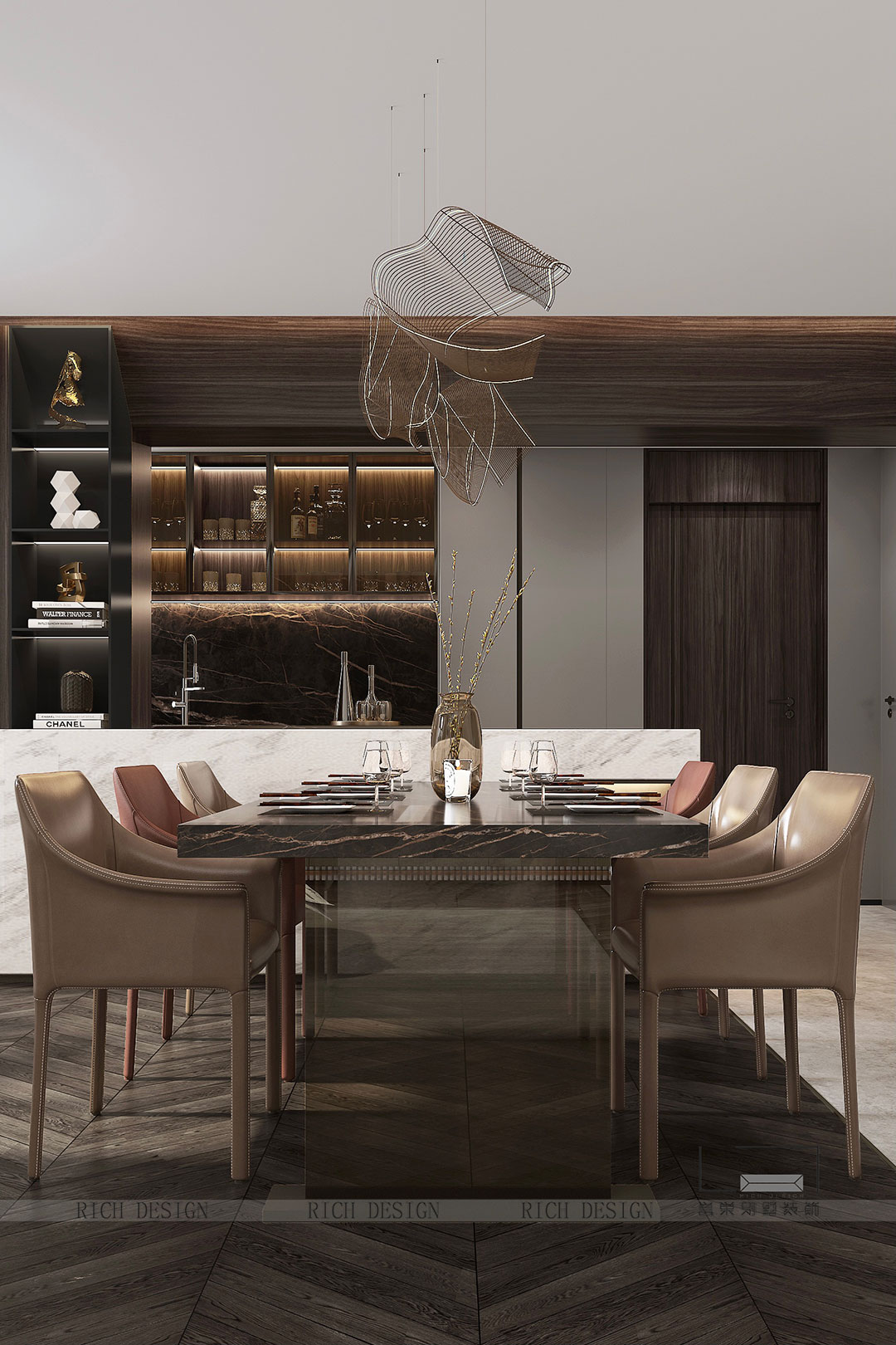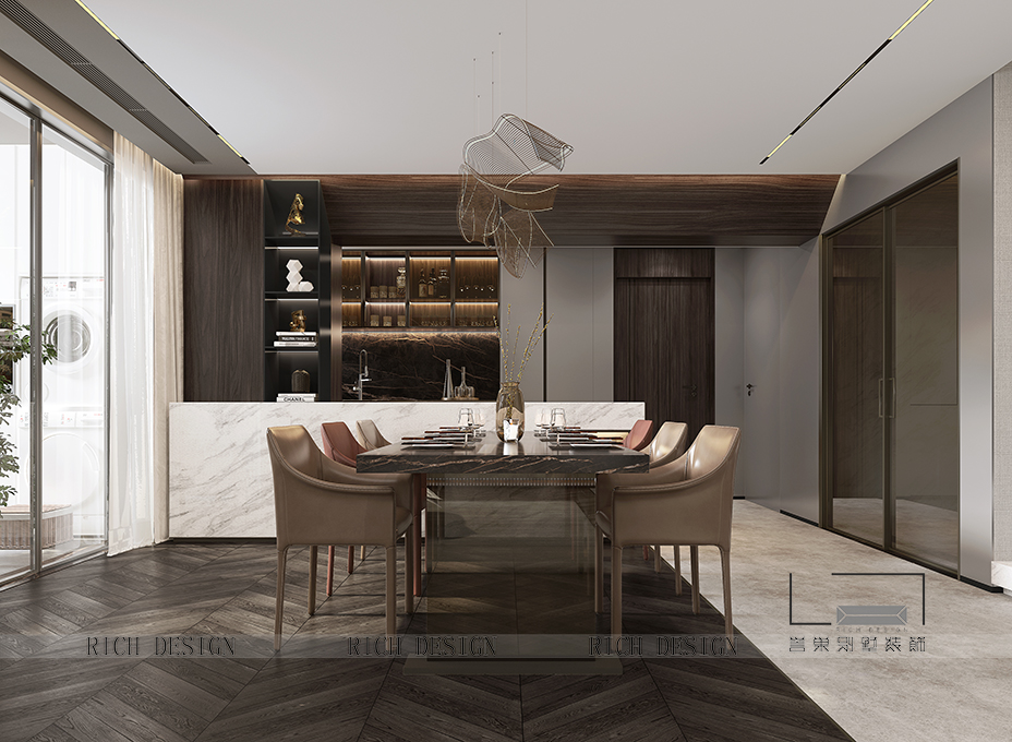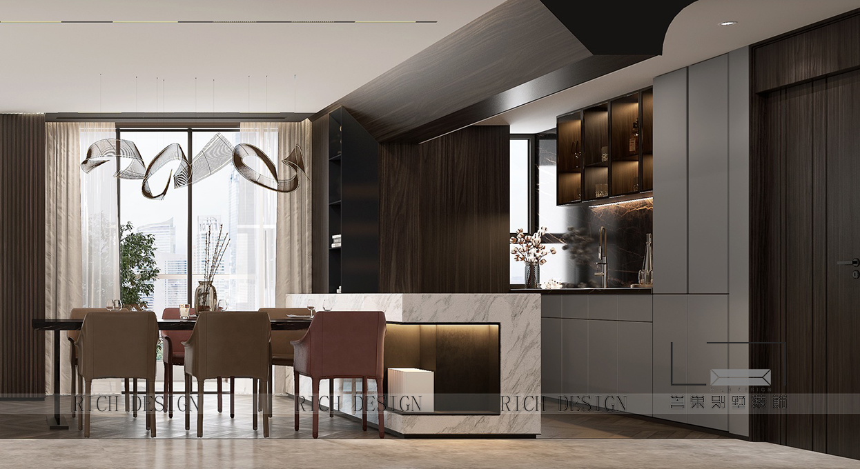 開放式廚房結(jié)合吧臺的格局,汲取質(zhì)感的奢華與尊貴,結(jié)合時尚金屬石材,鍛造居者對生活品位的追求。