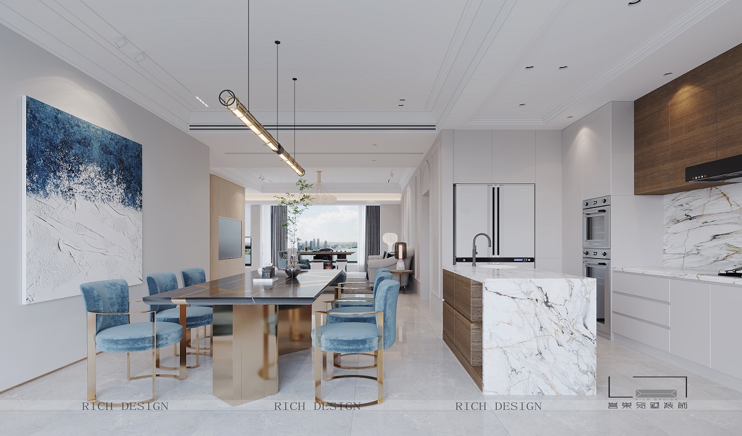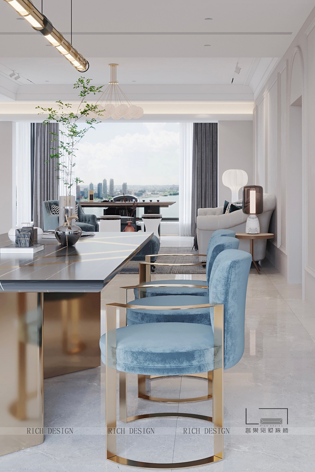 從客廳進(jìn)入到餐廳,簡歐墻線與黃銅輕奢外表交匯出典雅大氣的魅力,大理石幾何拼接地板與墻上意象元素采用藝術(shù)的形式融入到生活設(shè)計(jì)。