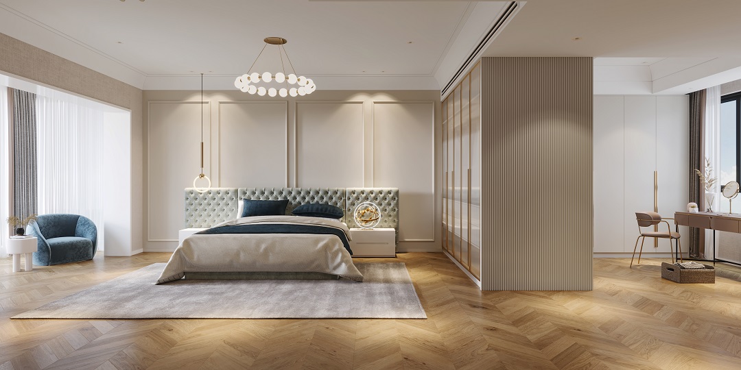 主臥套房內(nèi)設(shè)起居室、衣帽間和主衛(wèi),各功能區(qū)呈遞進(jìn)式布局。