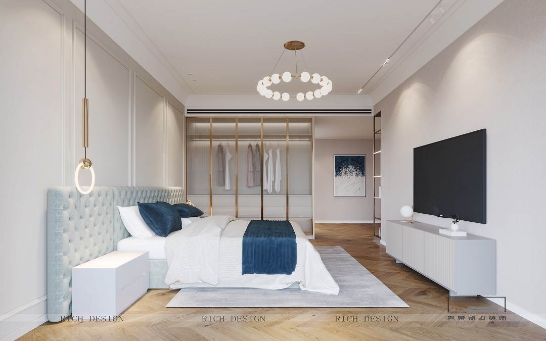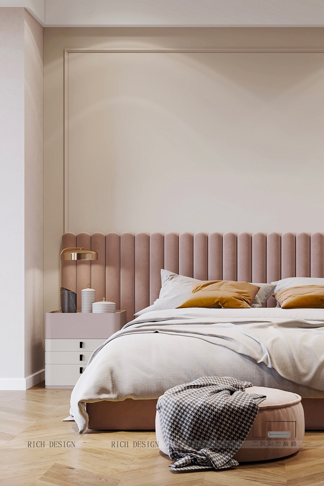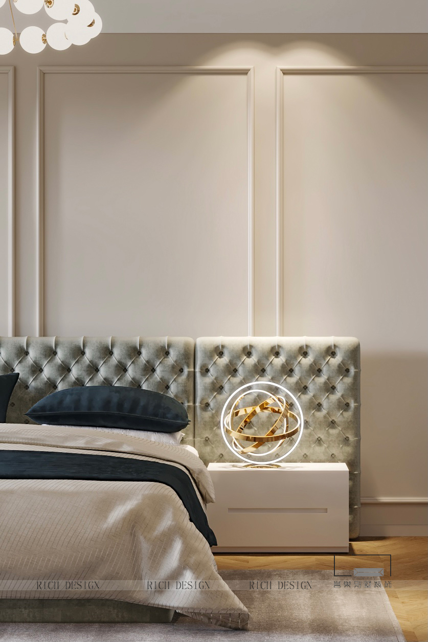 在立面上,將線性元素以空間圍合的方式貫穿其中,簡致,流暢,搭配簡歐輕奢家具,干凈素雅。結(jié)合大理石和金屬的紋理走向,讓空間背景兼具美觀舒適的同時(shí),植入安靜純粹的精神觀感。