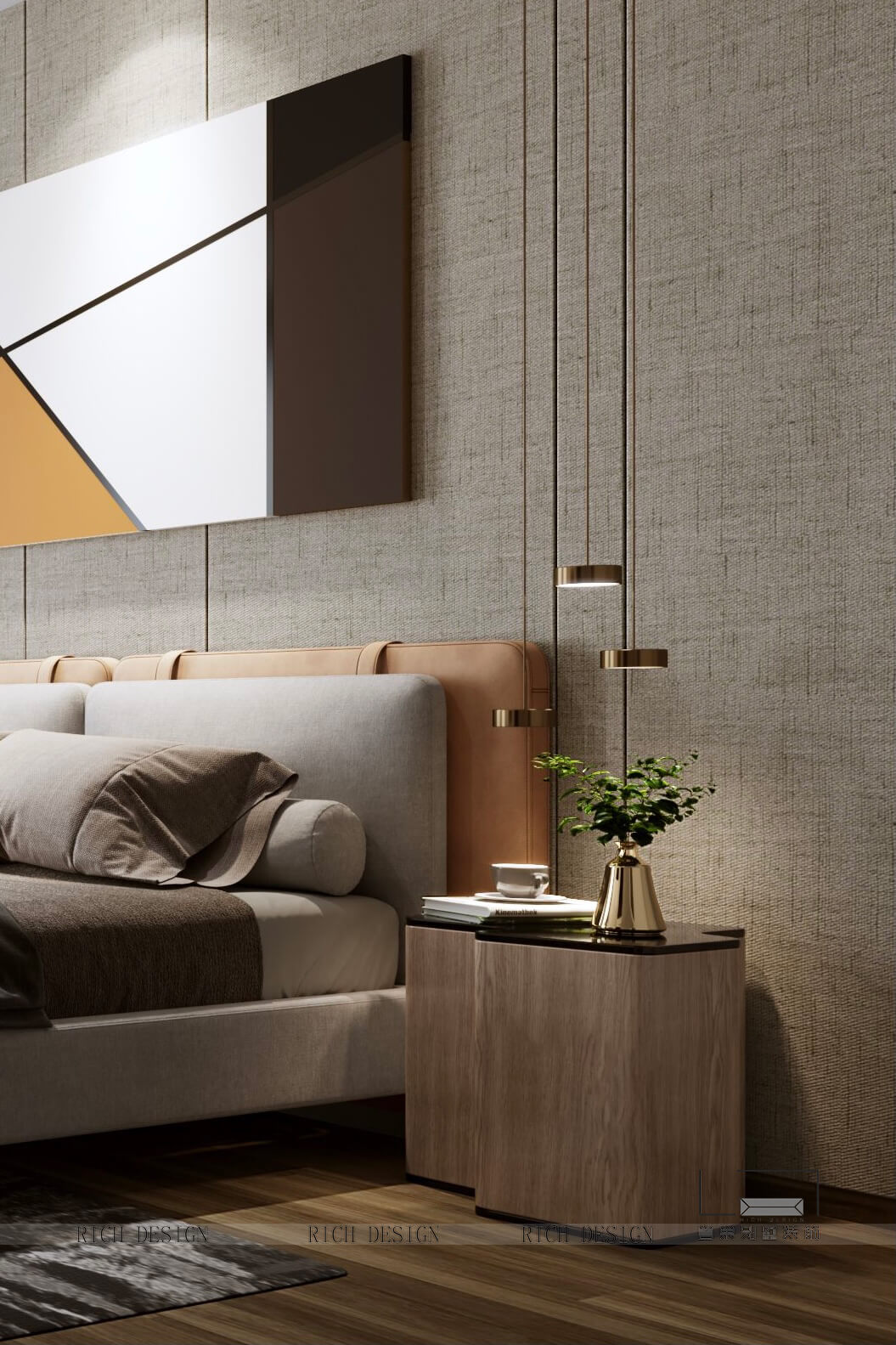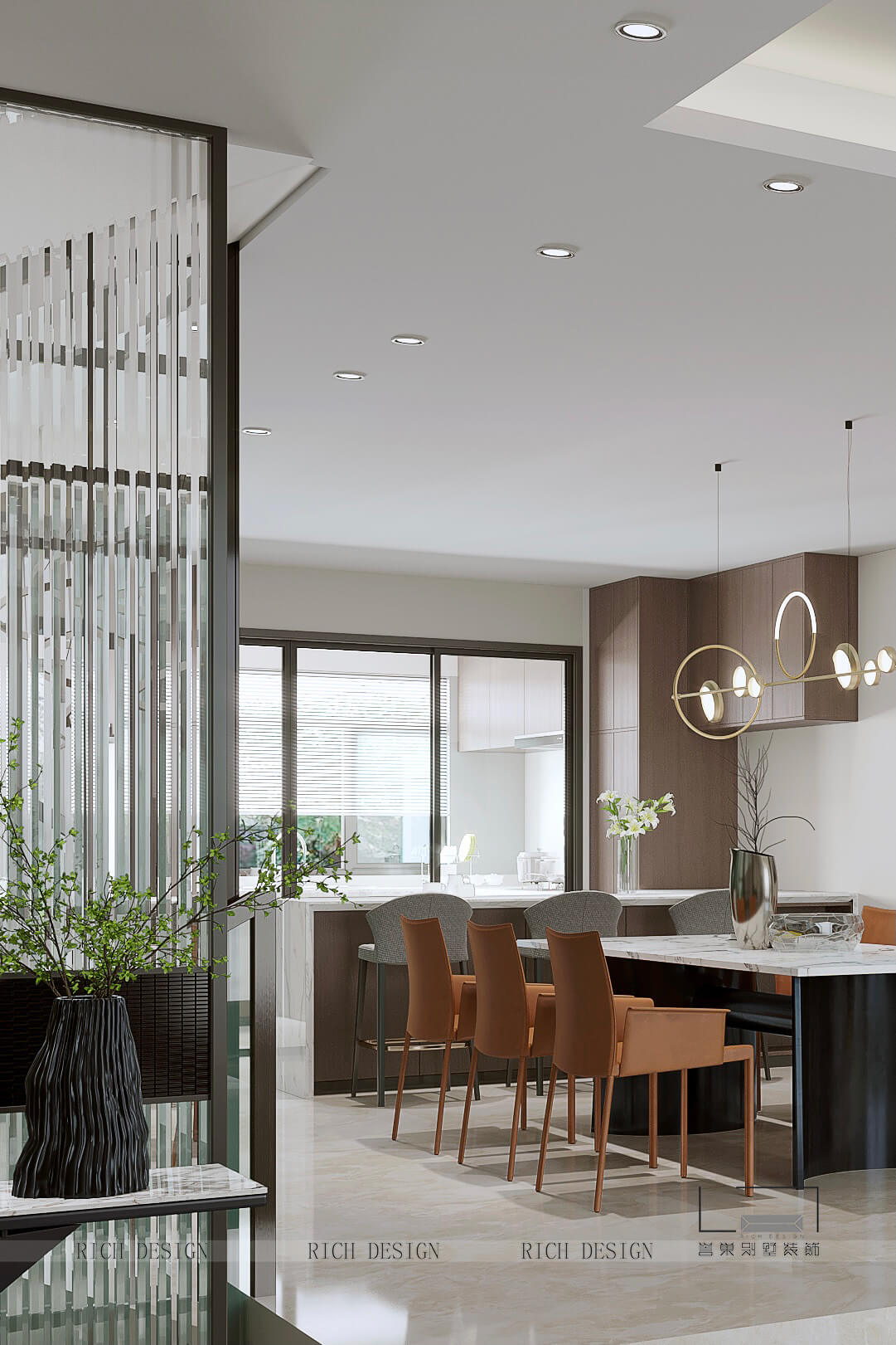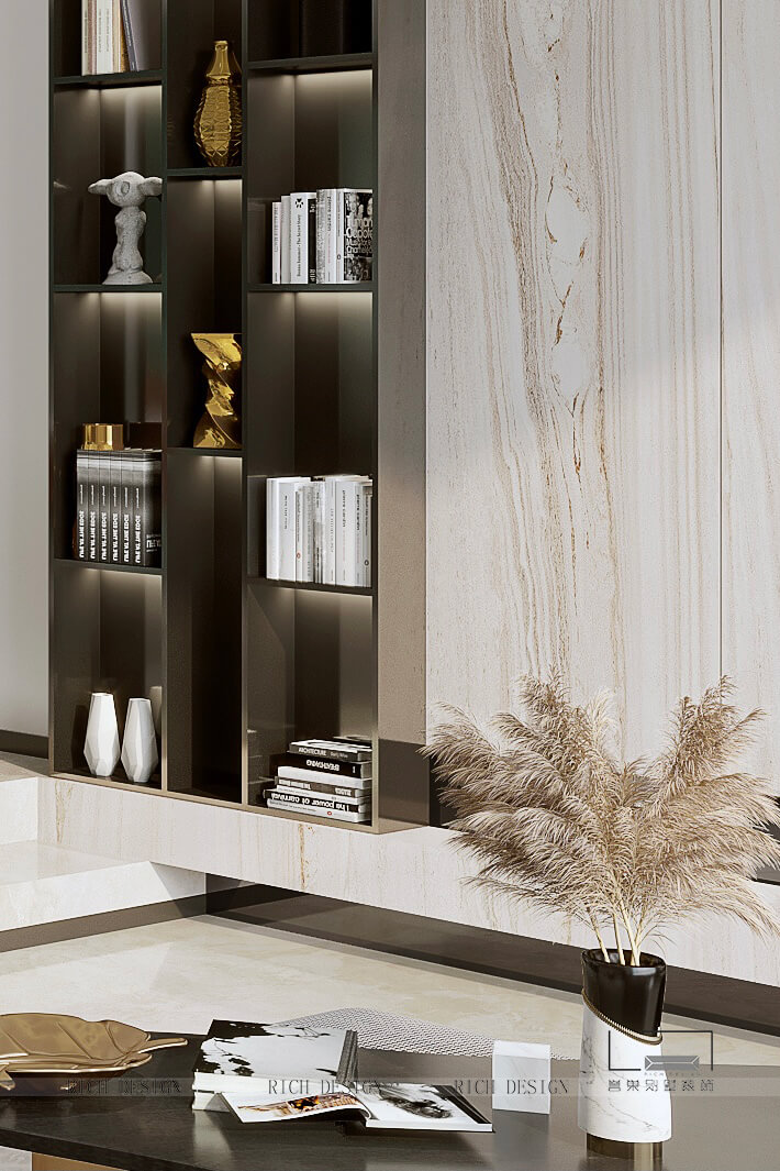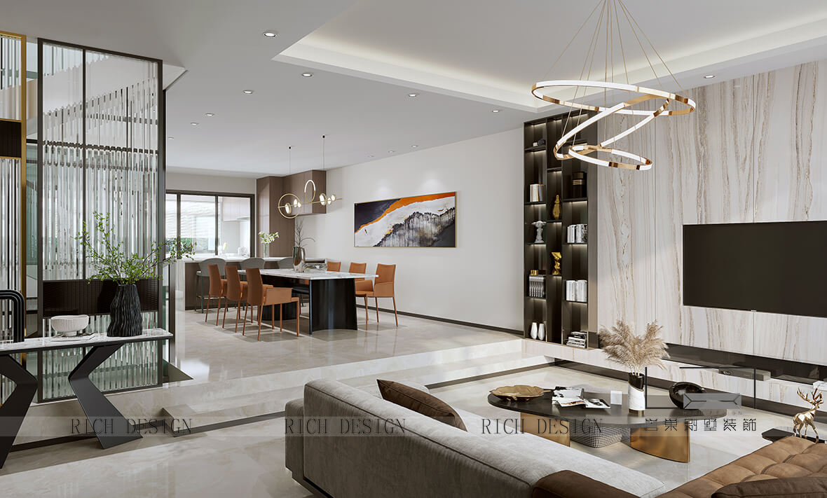 以大地色位主色調(diào)表達溫馨感,電視背景墻以木色條紋大理石巖板表現(xiàn)疏朗感,再以黃銅金屬圓圈吊燈作為點綴,節(jié)奏清晰分明,進而打破單調(diào)界限。