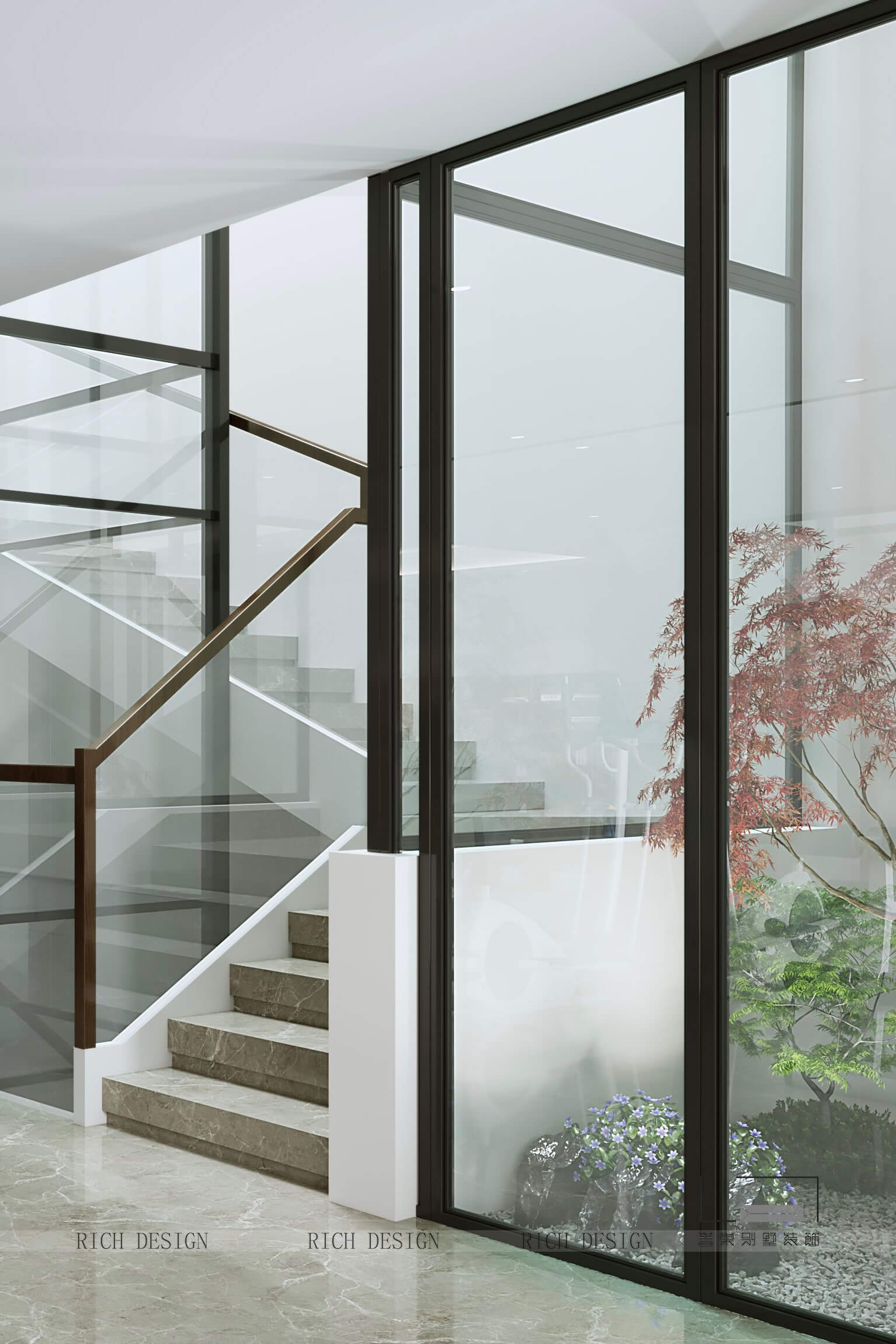 將樓梯天井的自然光納入室內(nèi),條紋玻璃將光折射到客廳,使整個休閑會客區(qū)充分享受到室內(nèi)外人與自然之間的互動。