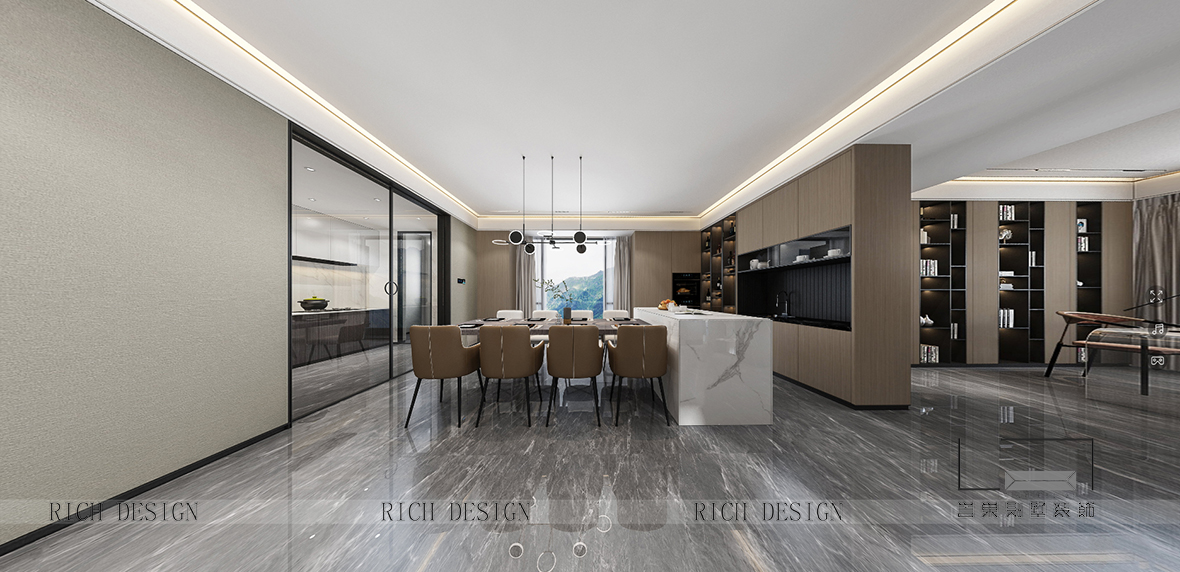 他負責的金迪項目一層都為公共空間,整體設計體現了動靜相宜的思辨,一層主要為餐廚空間,營造自由自主的社交空間,還有主客廳區(qū)域,劃分為會客廳,靜謐的休閑,抒寫隱逸氛圍。